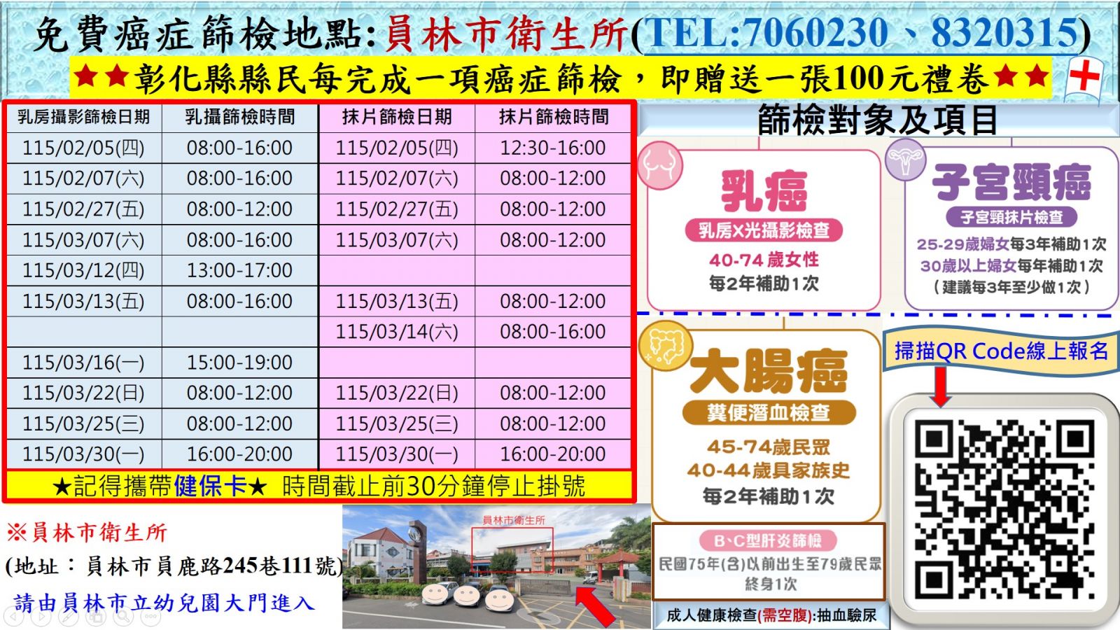 115年員林市衛生所2-3月份免費癌症篩檢日程表