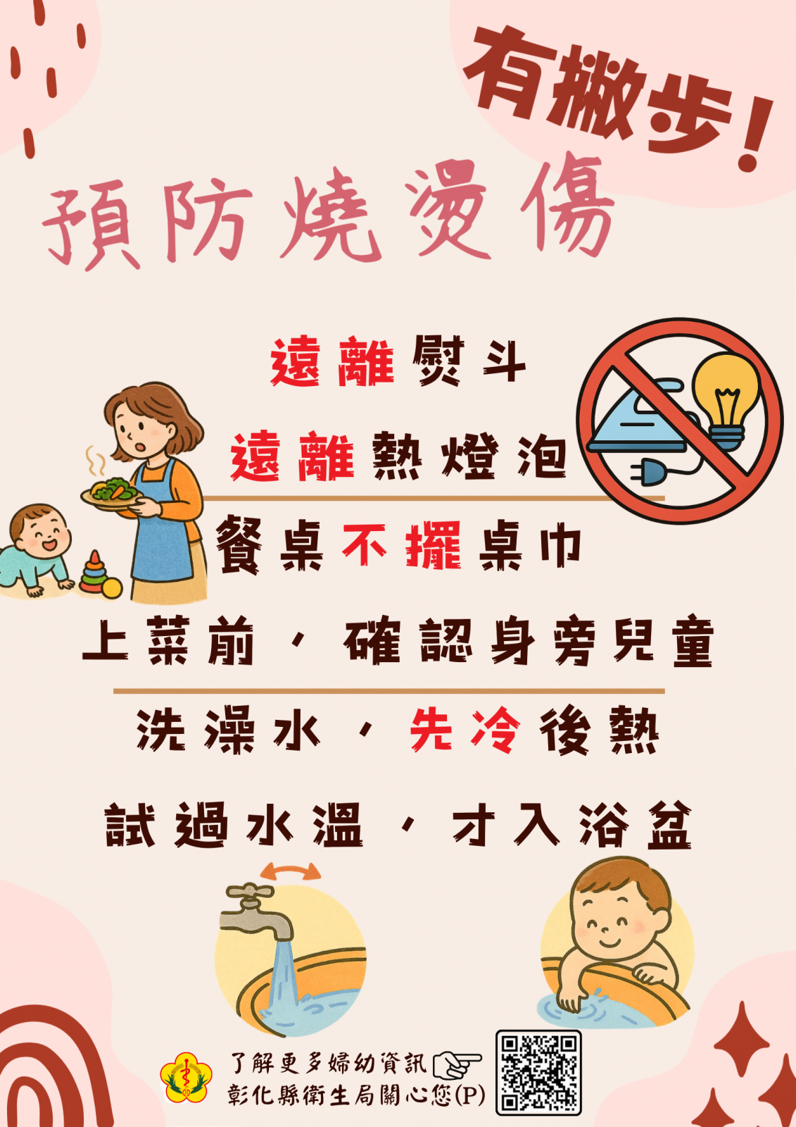 ::: 首頁 › 訊息專區 › 最新消息 最新消息 預防燒燙傷 有撇步! 2026-04-08 居家環境充滿陷阱: ★餐桌上不放置桌巾 ★熱湯或熱菜上桌前,確認幼兒是否在身旁 ★不讓幼兒接近熨斗、熱燈泡 ★洗澡時,先放冷水再放熱水 ★試過水溫才讓寶寶入浴盆 回列表