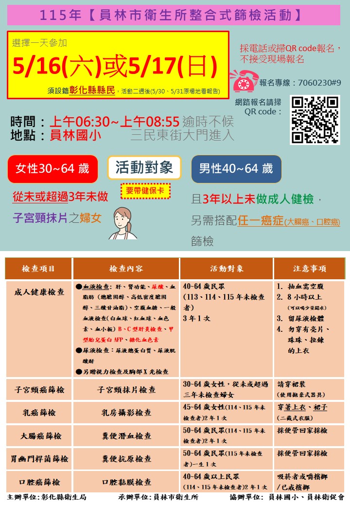 115年5月16日、5月17日【員林市衛生所整合式篩檢活動】